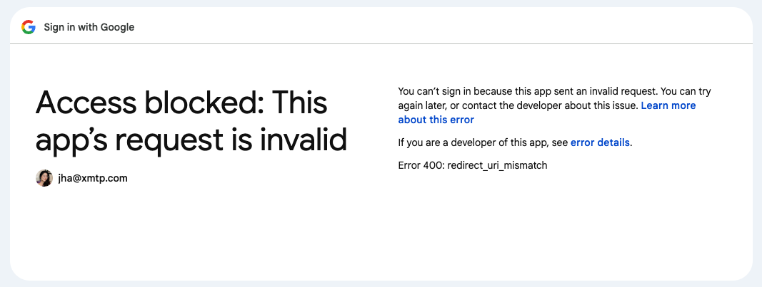If you’re the app developer, register the redirect URI in the Google Cloud Console.Request details: redirect_uri=XMTP Improvement Forum flowName=GeneralOAuthFlow